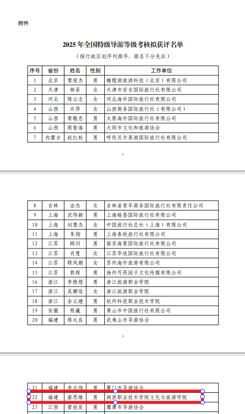 近日,2025年全国特级导游等级考核拟获评人选名单已公布。我校文化与旅游学院旅游管理专业廖思维老师经省文旅厅遴选推荐、文化和旅游部考核与终审答辩,成功入围名单。值得一提的是,廖思维...