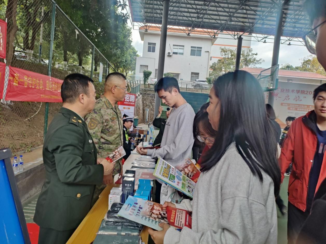 12月2日,我校联合龙岩市人民政府征兵办公室、新罗区交警大队、曹溪派出所在槟龙球场毕业生招聘会现场开展征兵国防暨安全教育宣传活动。
