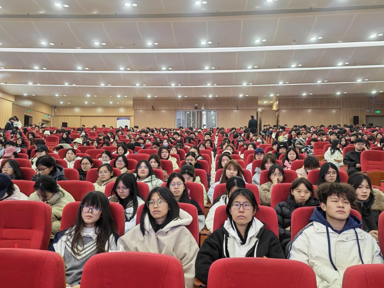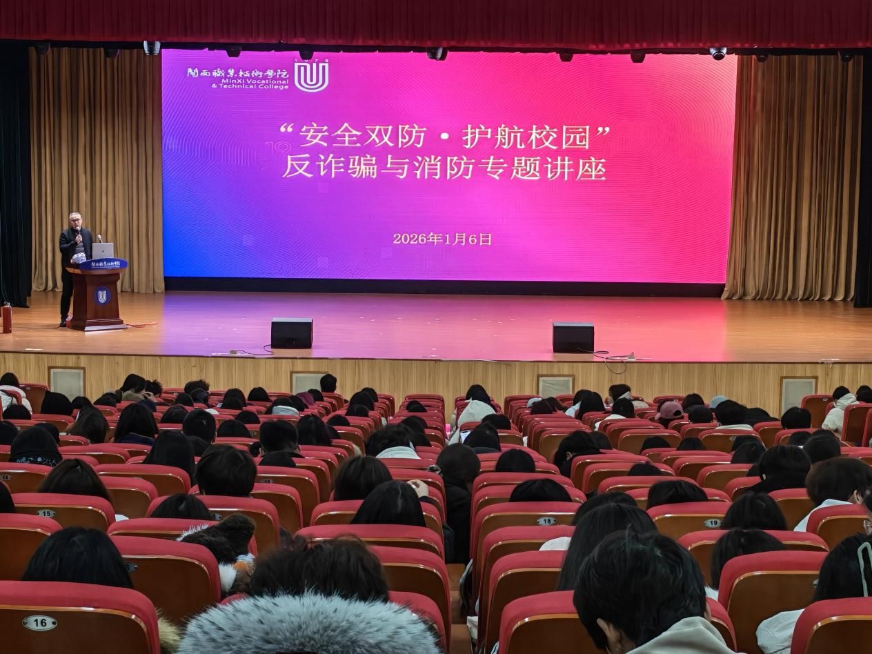 为切实提升校园安全防护水平,增强师生风险防范意识,2026.1.6下午,我校在大匠堂举办“安全双防·护航校园”反诈骗与消防专题讲座。全校学生干部及全体辅导员(约600人)集中参训。