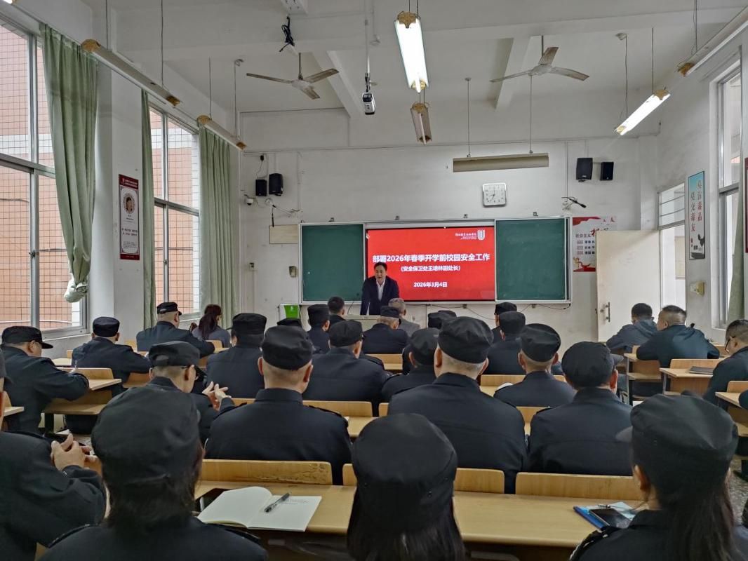 为切实筑牢校园安全防线,确保2026年春季开学平稳有序,3月4日上午,我校在良材楼101室召开春季开学前安全工作专题会。安全保卫处全体人员、学生工作处相关负责人、全体安保人员及消防维保人员参加会议。