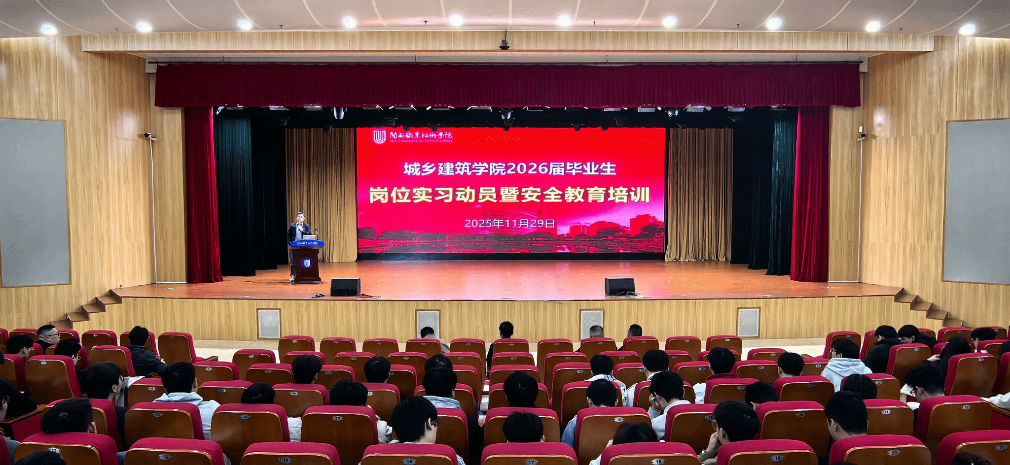 11月29日,城乡建筑学院2026届毕业生岗位实习动员暨安全教育在大匠堂举行。全体毕业生、院领导班子成员、专业负责人和辅导员参加。