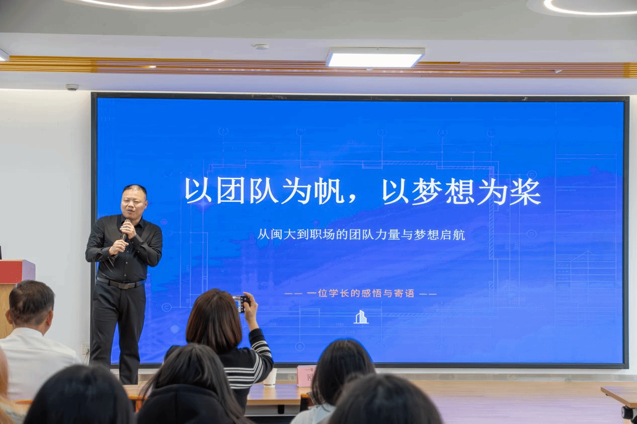 传承红色基因,打磨匠人之心 作为闽大校友,苏振渊以 “低着头进来、平着头读书、昂着头走向社会” 引发全场共鸣。他深耕建筑行业,以工匠精神为创业根基,强调专一、务实、精益求精;从苏区精神中汲取信念,鼓励学子修炼逆商,在逆境中坚持不放弃,用韧性筑牢人生高楼。