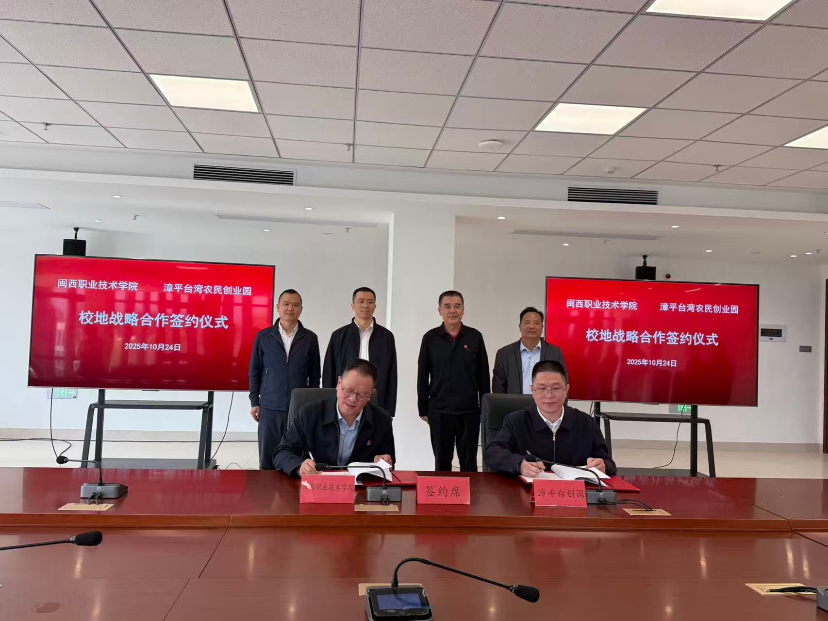 10月24日,校党委书记卢伟耀率队前往漳平台创园开展调研交流活动,校地双方举行了战略合作签约仪式。漳平市委副书记、台创园区党工委书记吴彦成,台创园区管委会主任、永福镇党委书记许赐江,校党委副书记、校长梁俊平,林伟能、卢兆梅、温献荣、张源峰、连玲娜等校领导及学院相关部门负责人参加活动。