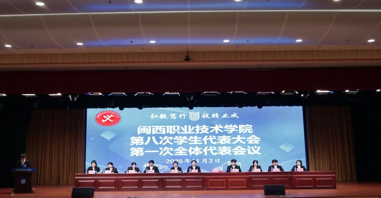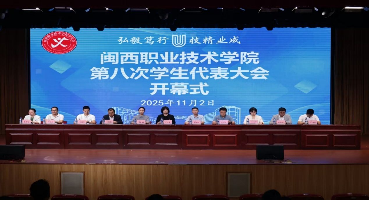 2025年11月2日,闽西职业技术学院第八次学生代表大会在校本部南校区大匠堂圆满召开。校党委委员、副校长连玲娜,共青团龙岩市委副书记郭朝龙,以及学校相关部门负责同志、各学院党委副书记、团委书记、大会代表、学生嘉宾等274人参加会议。