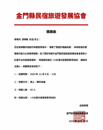 培训中,我校游婧敏老师依托腾讯会议平台,围绕“挖掘金门特色民宿与旅游内容”“设计符合小红书用户喜好的笔记结构,降低初阶从业者的操作门槛”等核心议题展开详细的解读。课程注重实操性与应用性,帮助协会会员快速掌握内容小红书线上运营技巧,有效解决民宿数字营销中面临的实际困惑。