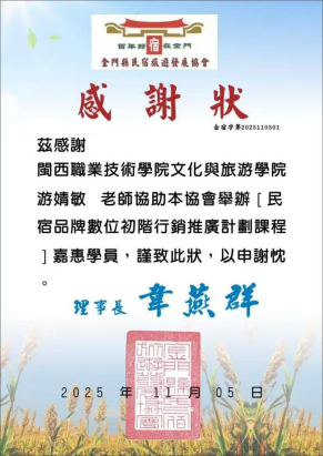金门民宿旅游发展协会理事长韦燕群对我校组织的培训表示热烈欢迎与衷心感谢,并在培训结束后专门发来感谢信,高度认可培训的专业性与针对性。