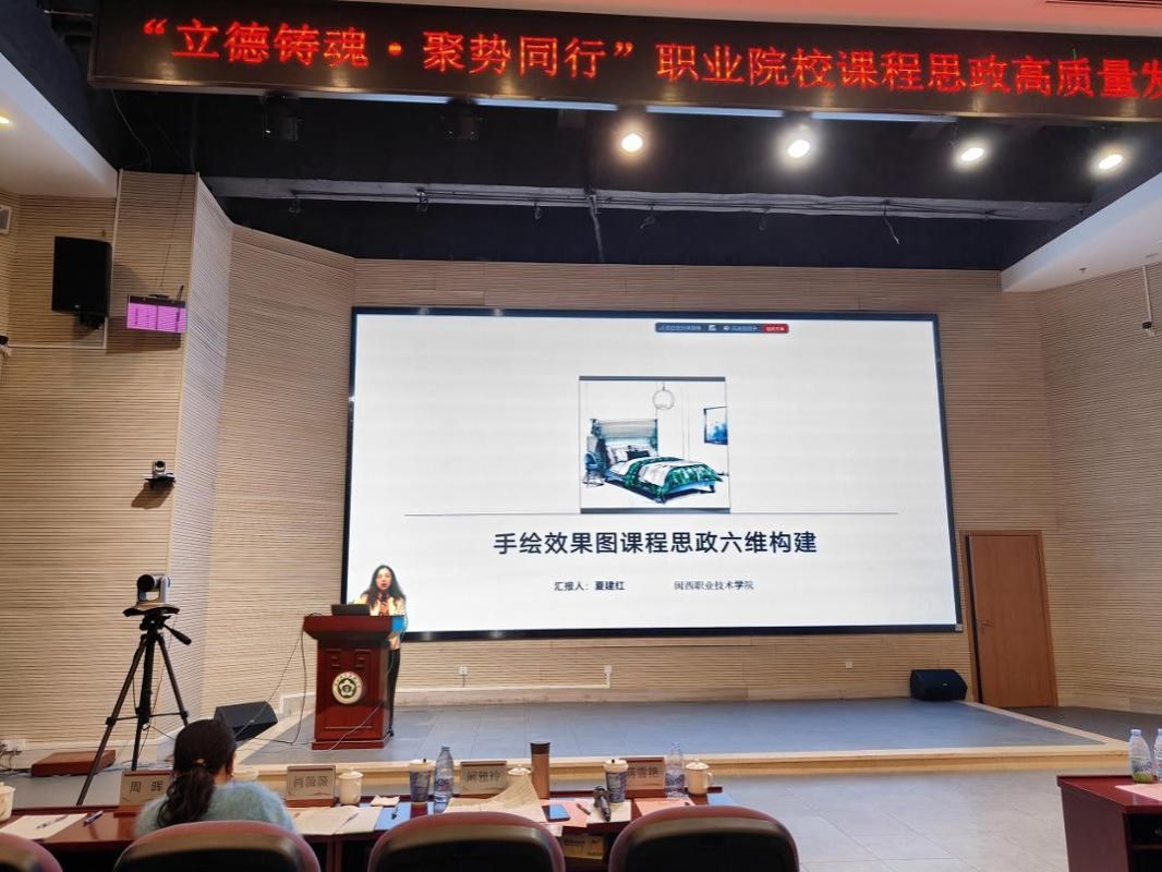 本次活动聚焦职业院校课程思政建设,通过线上直播形式,集中观看由广州职业技术大学主办的“立德铸魂·聚势同行—职业院校课程思政高质量发展研讨会”教学展示环节。闽西职业技术学院、广东梅州职业技术学院等6所职业院校的优秀教师进行课程思政教学展示与说课分享,并由专家现场从教学设计、教学实践、教学评价等多个方面开展点评。我校夏建红老师受邀并进行了“手绘效果图设计表现”教学展示,受到专家的肯定和同行们的认同。