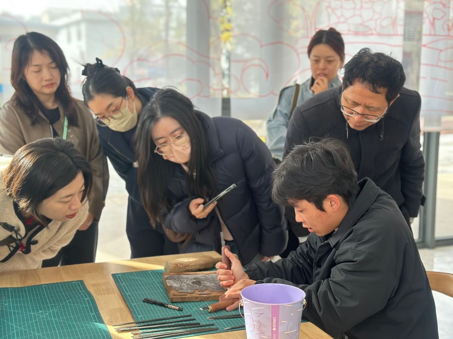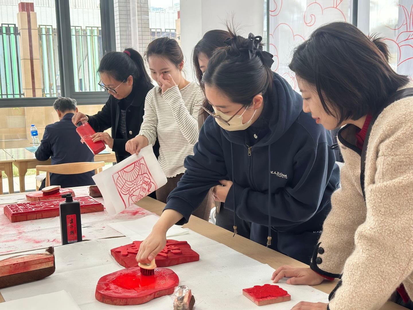 随后,我校“非遗传承人”工作室负责人吕春玲老师以“连城四堡雕版印刷”为题,系统讲解了该项非遗技艺的历史脉络与工艺特色。文化与旅游学院大一学生邹梁现场演示了雕版制作与印刷流程。学员们积极参与实践,亲手体验从雕版到成品的各个环节,在动手操作中深化了对非遗活态传承与美术教育融合的理解。