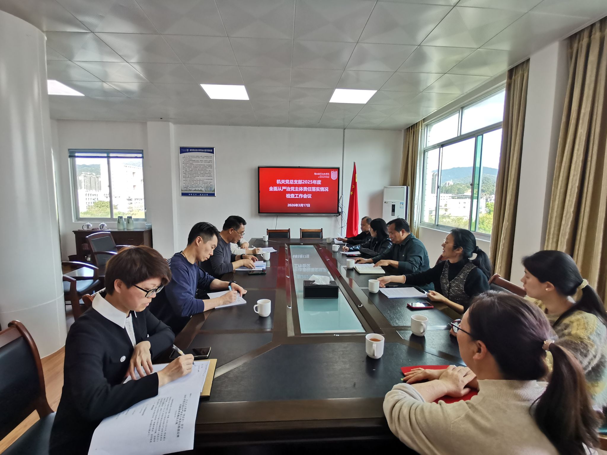 检查组上午通过查阅资料、现场核查等方式,对机关党总支部2025年度全面从严治党工作主体责任落实情况进行认真检查,重点围绕政治、思想、组织、作风、纪律建设及制度执行、问题整改等环节,对照清单查成效、找短板。检查组肯定了工作成效,现场反馈问题并提出整改意见,明确了整改方向。在下午召开的会议上,校党委副书记、检查组带队领导林伟能根据检查情况,剖析存在的突出问题,强调机关党总支部作为学校决策部署落实的“中枢神经”,全面从严治党成效关乎学校高质量发展,必须抓实整改。