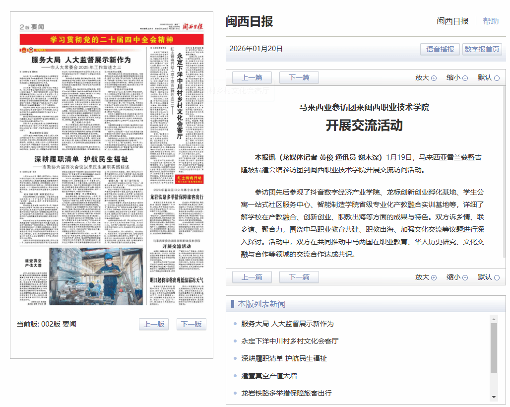 本报讯(龙媒体记者 黄俊 通讯员 谢木深)1月19日,马来西亚雪兰莪暨吉隆坡福建会馆参访团到闽西职业技术学院开展交流访问活动。