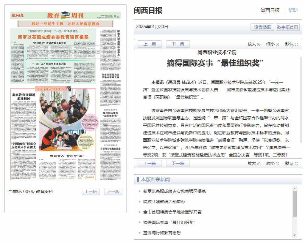 本报讯(通讯员 林茂才)近日,闽西职业技术学院荣获2025年“一带一路”暨金砖国家技能发展与技术创新大赛——城市更新智能建造技术与应用实践赛项(高职组)“最佳组织奖”。