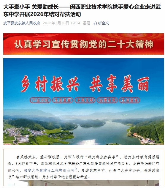 春风拂武东,爱心润校园。为深入践行“我为群众办实事”,助力乡村教育提质增效,3月27日下午,闽西职业技术学院联合广东长新隆智能科技有限公司、龙岩华兴彩印有限公司、福建大华鑫建设工程有限公司,走进武东中学,开展“大手牵小手,关爱助成长”结对帮扶活动,为乡村学子送去温暖与希望。