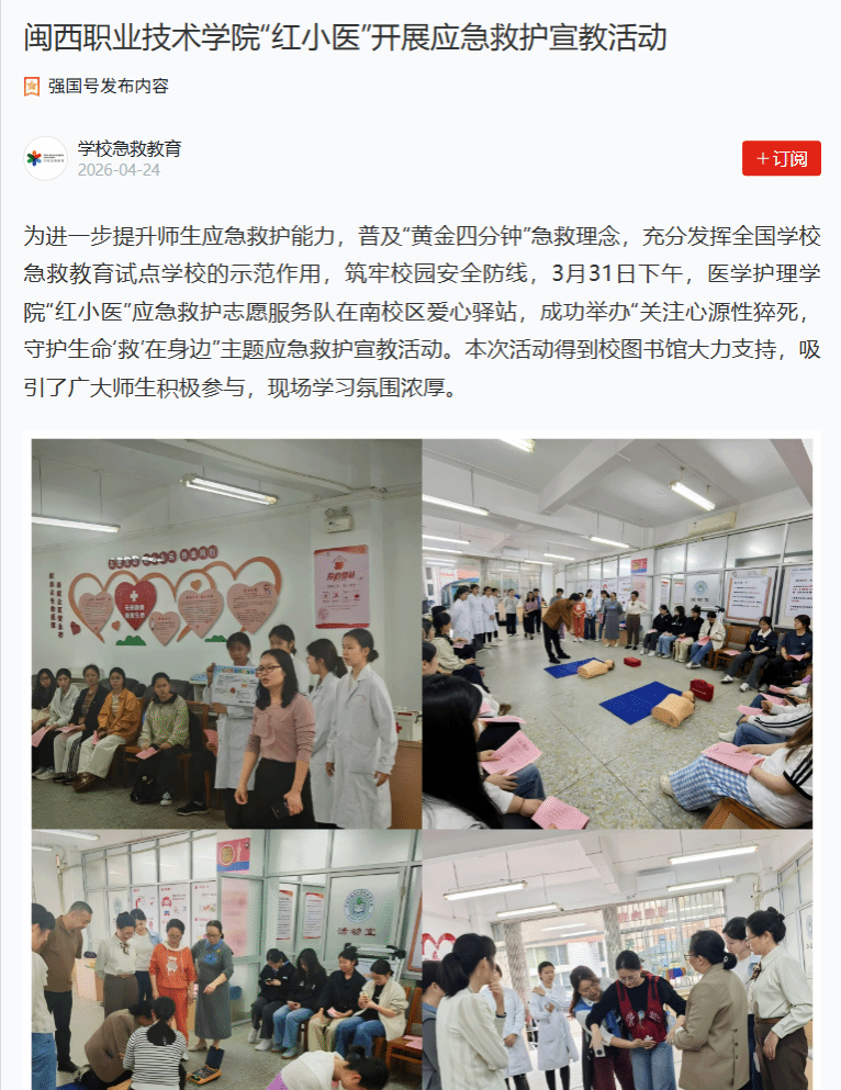 为进一步提升师生应急救护能力,普及“黄金四分钟”急救理念,充分发挥全国学校急救教育试点学校的示范作用,筑牢校园安全防线,3月31日下午,医学护理学院“红小医”应急救护志愿服务队在南校区爱心驿站,成功举办“关注心源性猝死,守护生命‘救’在身边”主题应急救护宣教活动。本次活动得到校图书馆大力支持,吸引了广大师生积极参与,现场学习氛围浓厚。