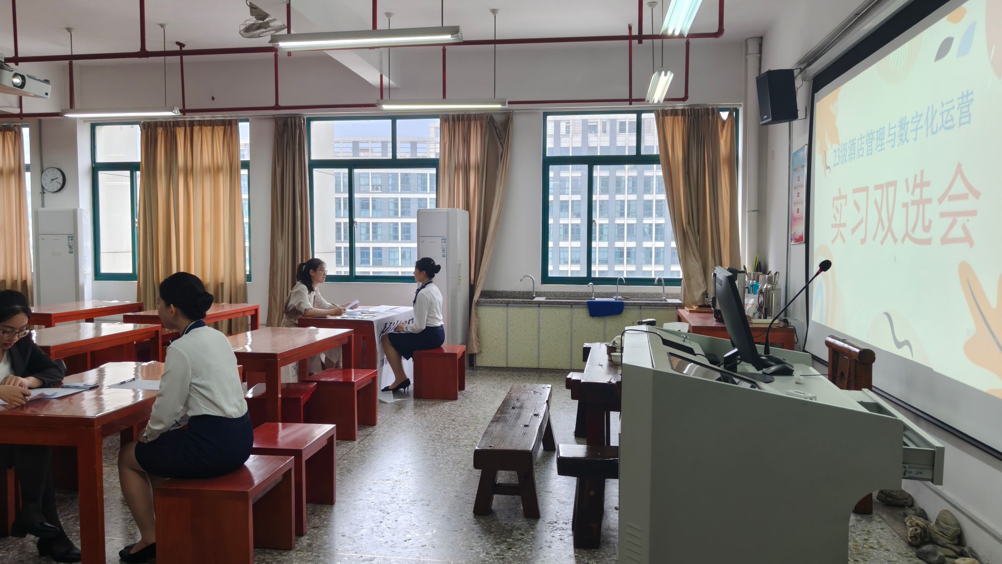 2025年10月28日,文化与旅游学院酒店管理与数字化运营专业实习生双选会在学院实训中心成功举办。本次双选会吸引了10家知名酒店品牌及2家精品民宿参与,为酒店管理专业学生提供了丰富的实习岗位和多元化的职业发展平台。