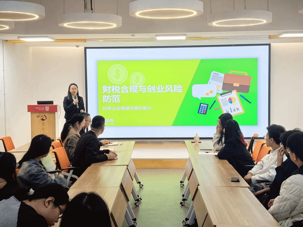 讲座以"财税合规管理与创业风险防范"为主题,围绕税务登记申报、发票管理、会计核算"三板斧",结合初创企业典型案例,系统剖析了法律财务、市场运营等常见风险,并深度解读了重点群体创业就业税收优惠政策,为现场师生构筑起企业稳健发展的知识基石。
