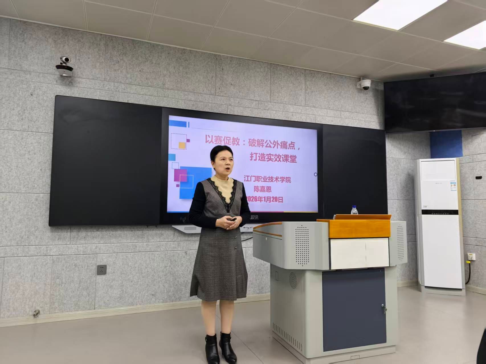 2026年1月20日下午,公共教学部特邀江门职业技术学院英语教研室主任陈嘉恩副教授,举办了一场题为《以赛促教:破解公外痛点,打造实效课堂》的专题讲座。公共教学部全体教师参加了此次讲座。