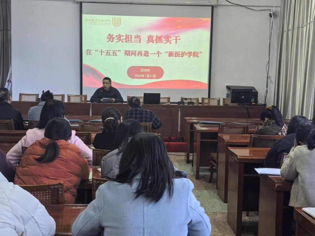 党委书记邱伟彬作题为《务实担当 真抓实干——在“十五五”期间再造一个“新医护学院”》的讲话及2025年“中医+康养”特色办学建设工作报告。他指出,“十四五”期间,学院以“中医+康养”特色办学为突破口,在人才培养等方面取得阶段性成果,但仍存在专业建设内涵不深、产教融合层次不高等短板。面向“十五五”,他强调学院要立足实际,走好“中医+康养”特色发展道路,围绕“升本科、以群建院、创特色”目标,确保任务落实见效。他号召全体教职工要有以时不我待的紧迫感、舍我其谁的责任感,开拓创新、务实担当,推进特色办学建设做到“三真三有”,力争在“十五五”实现学院发展的新跨越。