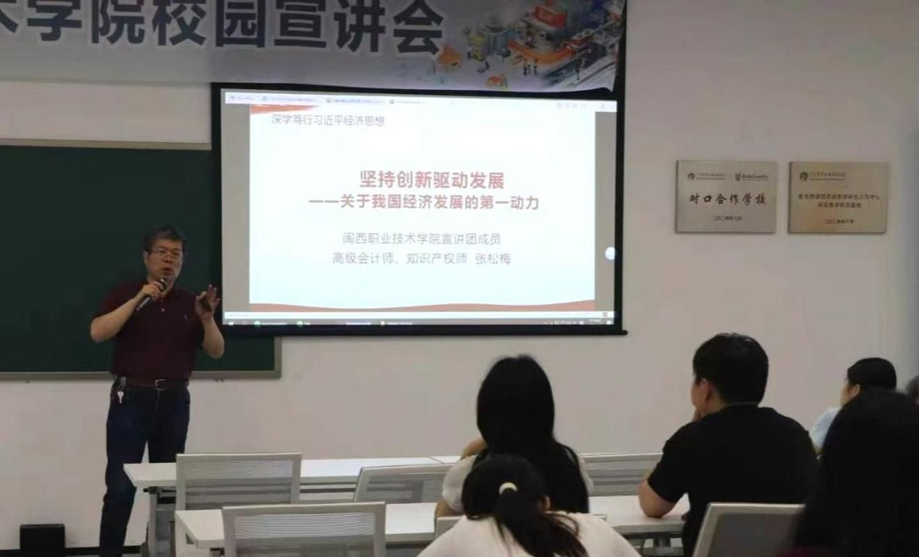为深入推动习近平经济思想进教材进课堂进头脑认真落实《全面推进"大思政课"建设的工作方案》,4月7日校宣讲团成员、校离退休党总支第一支部党员、高级会计师、知识产权师张松梅分别在万源楼409和实训室E为财经商贸学院学子作学习宣传习近平经济思想专题系列讲座。财经商贸学院团委负责人、入党积极分子、青马班学员、2024级和2025级团员学生代表参加系列宣讲活动。宣讲活动由校宣传部(统战部)、财经商贸学院党委、马克思主义学院、校离退休党总支联合承办。