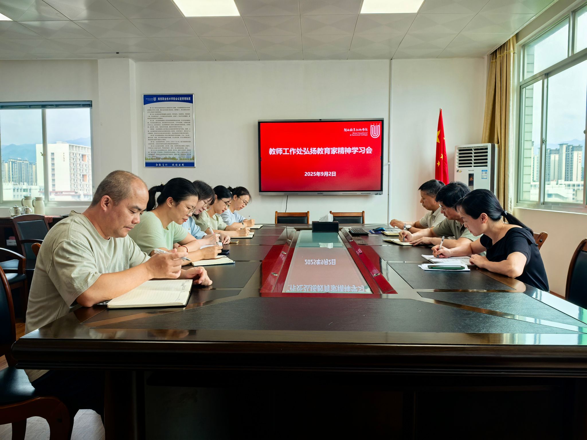 会上,教师工作处全体人员学习了《福建省弘扬教育家精神加强新时代高素质专业化教师队伍建设若干措施》和《新时代高校教师职业行为十项准则》。大家表示,要坚持用教育家精神铸魂,自觉锤炼高尚师德,持续提升职业能力,努力做好管理服务工作。