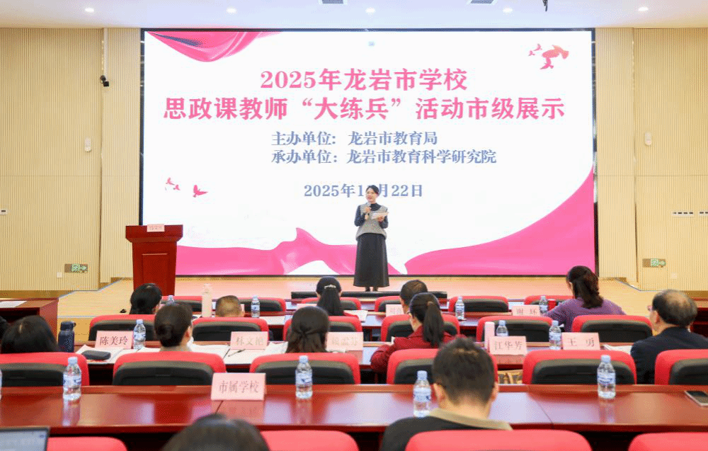 11月22日,2025年龙岩市学校思政课教师“大练兵”市级展示活动举行。本次活动由龙岩市教育局主办、龙岩市教育科学研究院承办,汇聚全市大中小学各学段优秀思政课教师代表,通过教学展示、专家点评、研讨交流,全面展现我市推进大中小学思政课一体化建设的实践成果。马克思主义学院教师钟秋华、张淑芬参加本次“大练兵”展示活动。