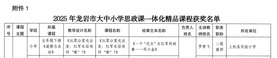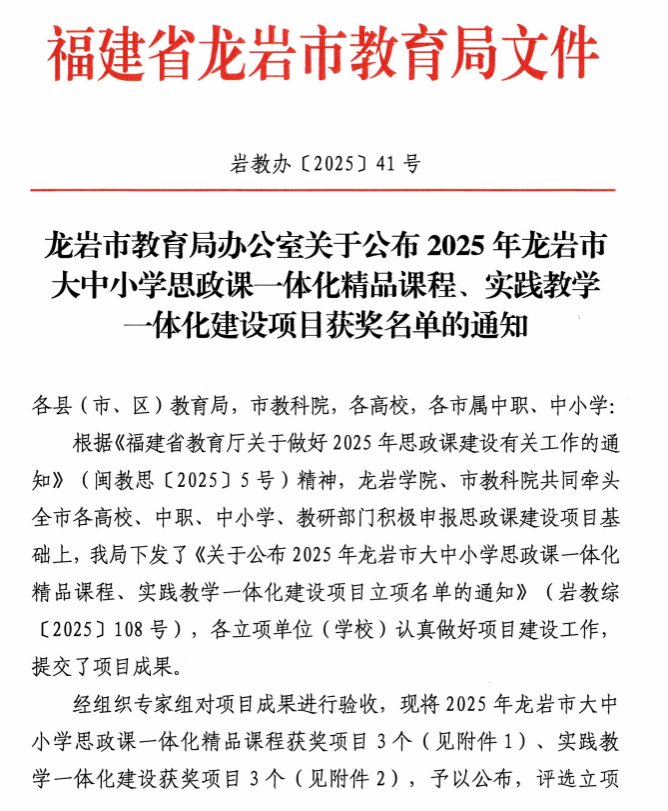 近日,龙岩市教育局公布了2025年龙岩市大中小学思政课一体化精品课程、实践教学一体化建设项目获奖名单,我校马克思主义学院3个项目入选龙岩市大中小学思政课一体化精品课程,3个项目入选实践教学一体化建设项目。