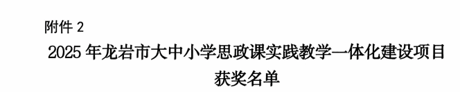 龙岩市大中小学思政课一体化精品课程、实践教学一体化建设项目中获奖