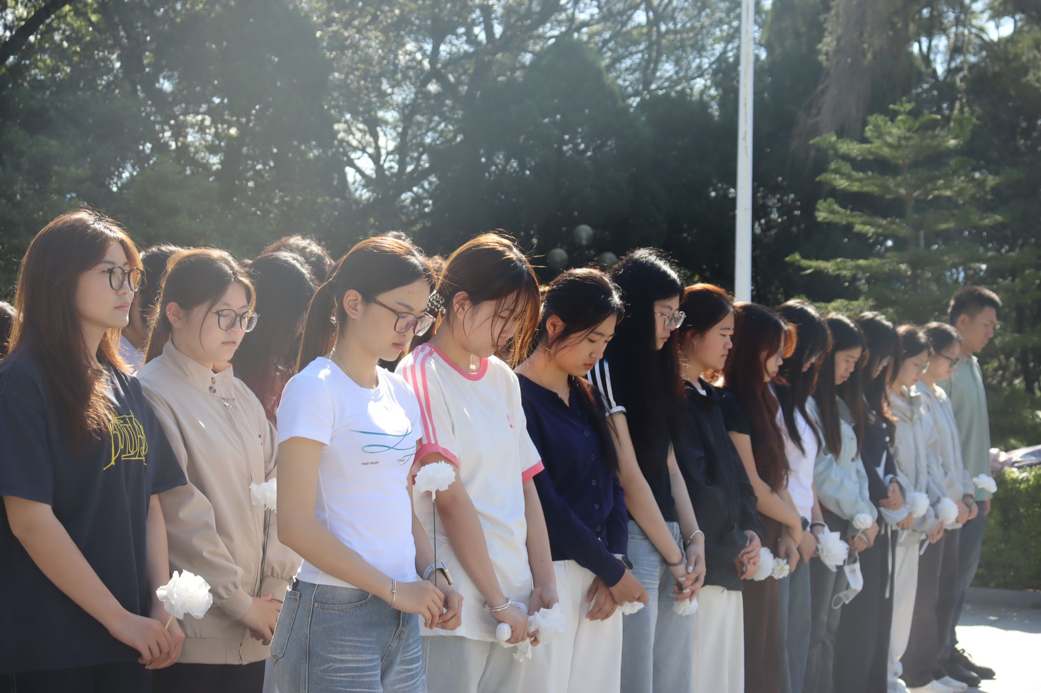 默哀仪式结束后,师生们手持洁白小花,缓步走向革命烈士纪念碑,郑重地将小白花敬献于碑前,绕行纪念碑一周,驻足瞻仰。一朵朵洁白的小花,承载着师生们对先烈的深切缅怀与无限敬仰;一次次庄重的驻足,诉说着新时代青年对革命精神的传承与坚守。