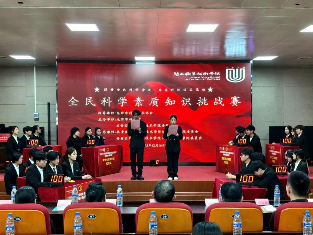 近日,闽西职业技术学院团委与龙岩市科技馆联合主办的“2025年闽西职业技术学院全民科学素质知识挑战赛”在我校顺利举行。本次赛事由信息工程学院团委和文化与旅游学院团委共同承办。龙岩市科协副主席徐锦清、校团委书记陈愉、龙岩市科技馆馆长严众能、新罗区科协副主席张平等嘉宾出席活动。