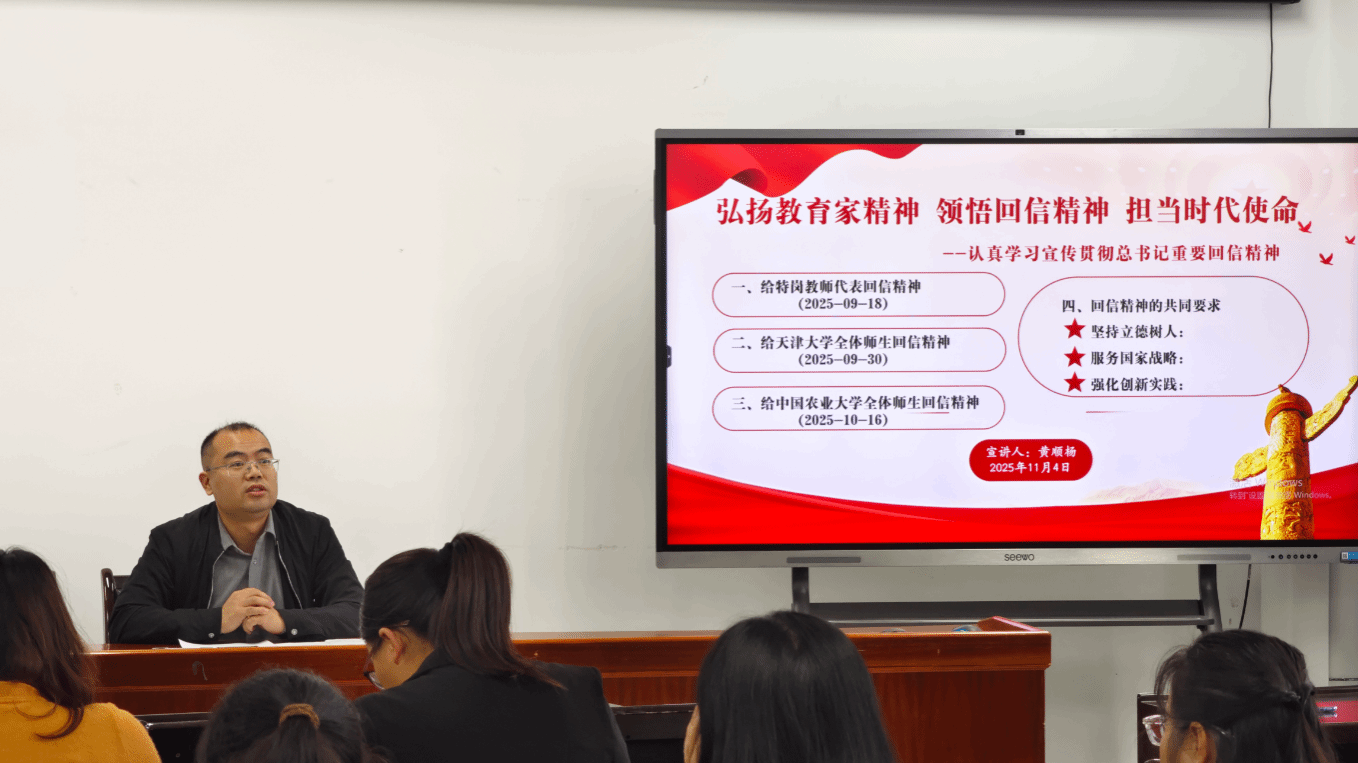 黄顺杨副院长梳理了习近平总书记近期给特岗教师代表、天津大学及中国农业大学全体师生的重要回信精神,指出回信深刻体现了党中央对教育事业和教师队伍建设的高度重视,为新时代教育发展与人才培养指明了方向。他强调,广大教师应深刻领会弘扬教育家精神的时代内涵,坚守育人初心,扎根教学一线,不断提升教书育人本领,努力培养德智体美劳全面发展的社会主义建设者和接班人。