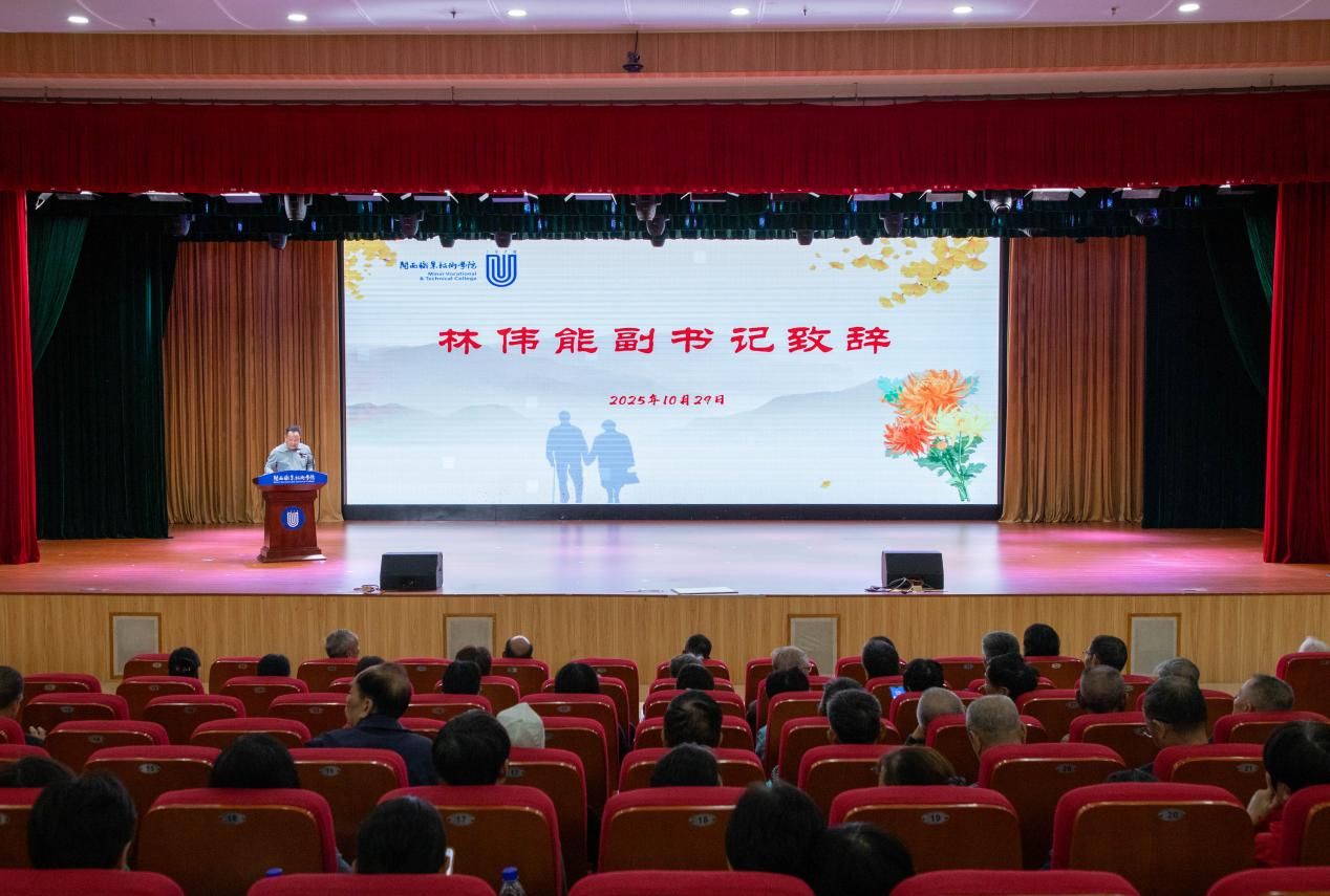 校党委副书记林伟能主持会议并受卢伟耀书记委托为大会致辞。在致辞中,林副书记深情祝愿老同志们节日快乐,身体硬朗,阖家幸福!对老领导、老前辈们多年来一如既往关心支持学校的发展表示了感谢,同时希望老同志们发挥自己的政治优势、经验优势,搭建起传帮带、共提升的桥梁纽带,通过“老带新”“强带弱”结对,把革命传统、工作经验融入年轻一代成长培养中,为学校的建设添活力、增实效。