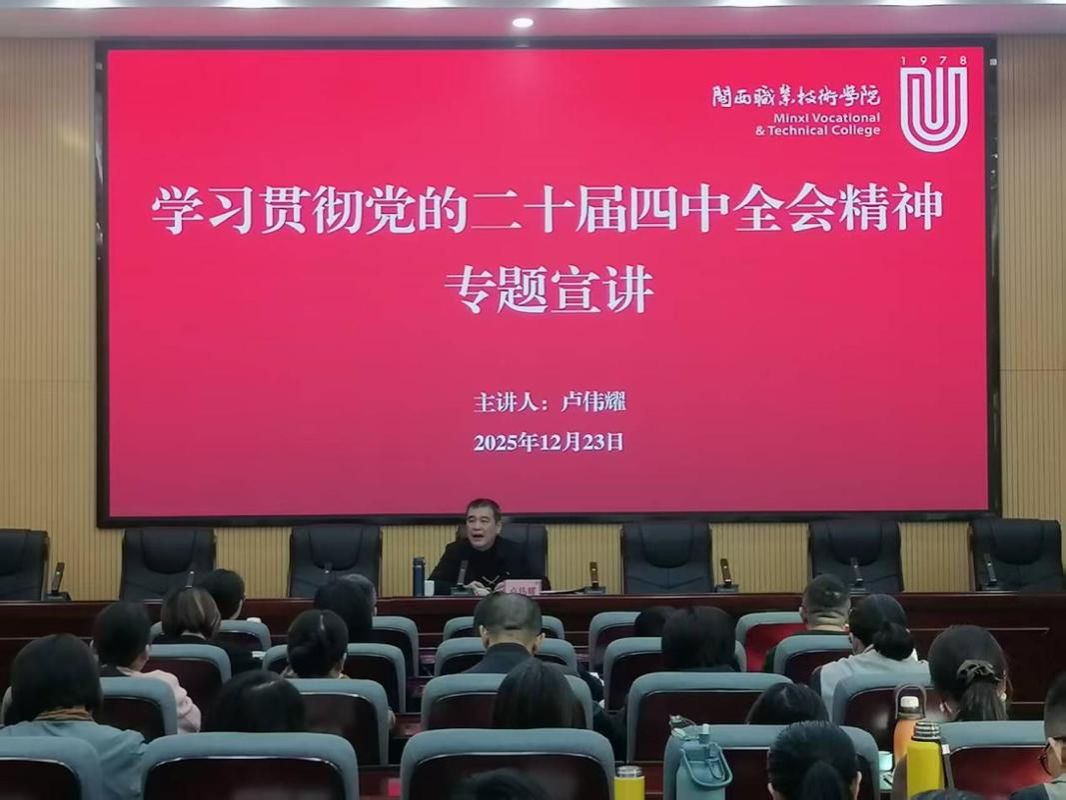 接着,校党委书记卢伟耀作《学习贯彻党的二十届四中全会精神专题宣讲》辅导报告,引导干部深刻把握“十五五”时期国家发展总目标与学校中心任务的衔接,提出“责任协同与文化赋能”的三点要求:一是“明身份、担责任”,党务干部需强化身份意识,以“功成必定有我”的担当压实党建主责;二是“知同事、懂协同”,通过深入了解团队形成共识,提升协作效率;三是“掌分寸、成大事”,借客家土楼“外圆内方”文化精神,倡导“宽以待人、细于做事”的智慧,凝聚团队合力攻克发展难关。